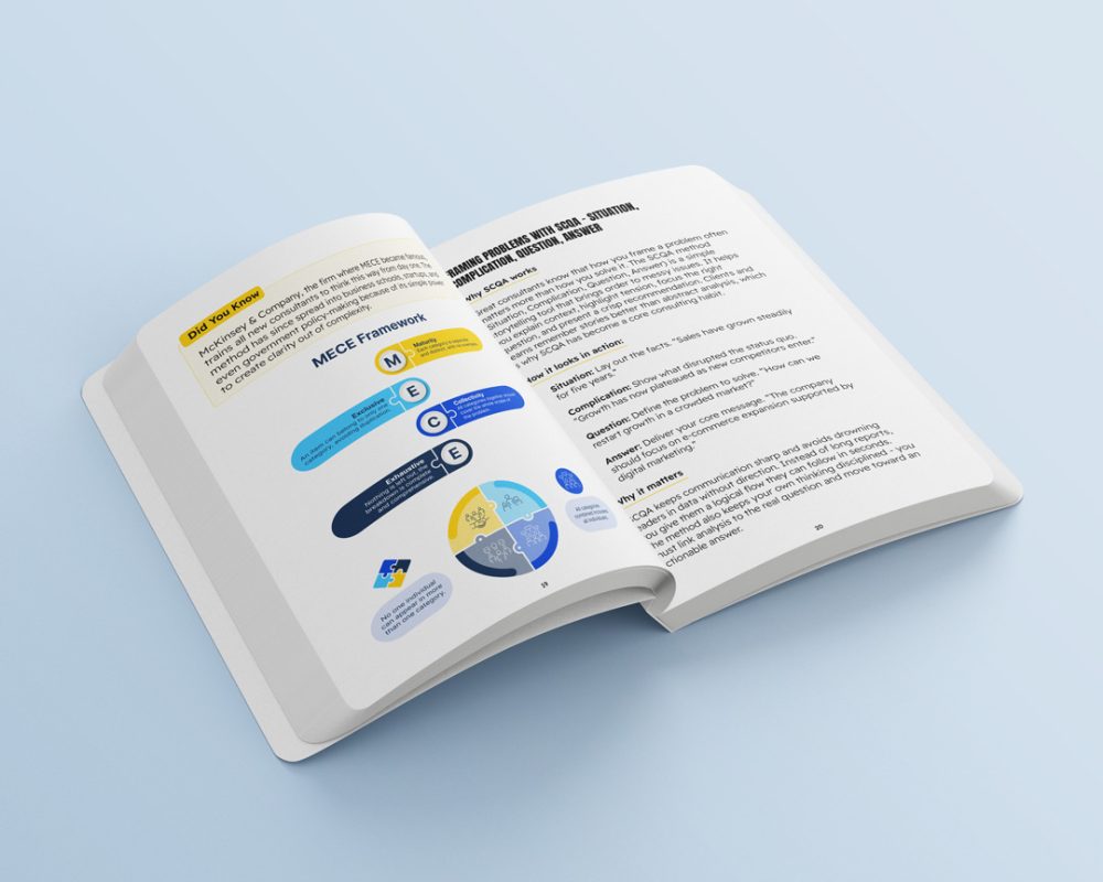 This ebook walks you through the entire consulting approach, from defining and diagnosing complex issues to building strategies that deliver measurable results. It presents step-by-step frameworks used by top consulting firms, adapted for practical use in any organization.